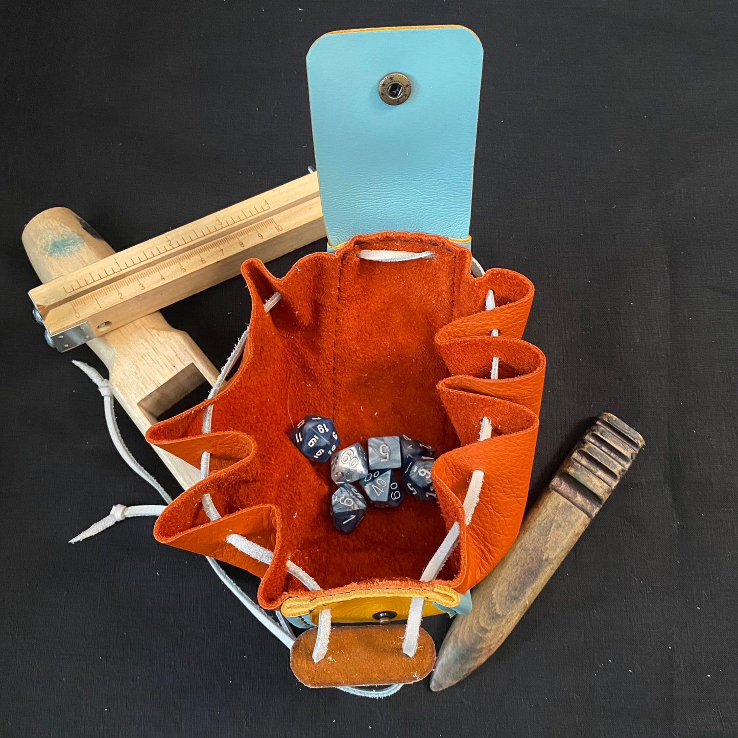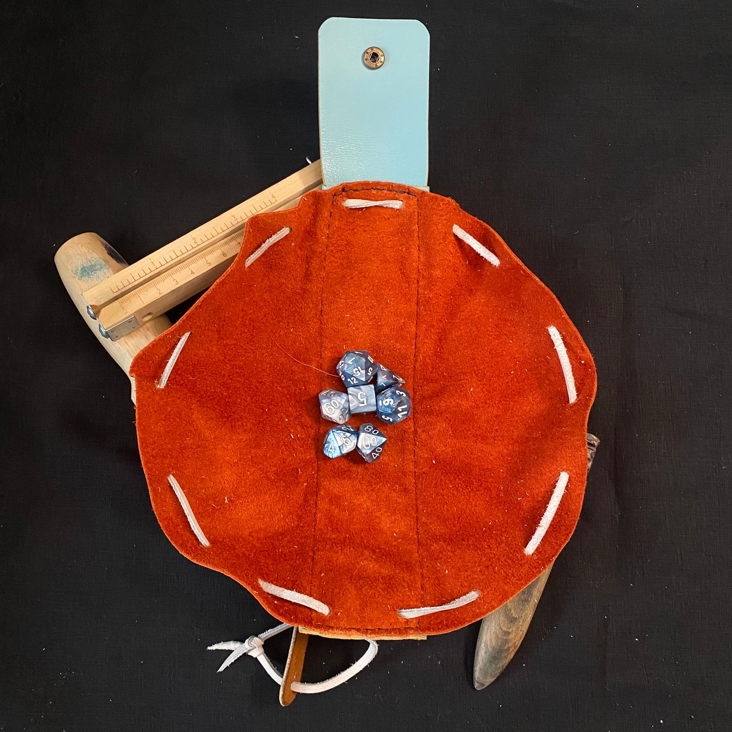 This is the pouch that I use for holding (some of) my dice, but it can also hold coins, trinkets, neat rocks, bones, or anything else you might find interesting! This particular design is inspired by the gorgeous warm tones of Air Nomad clothing and an air bending master's signature tattoos as we see them in ATLA. It holds 6-7 sets of polyhedral dice comfortably. This pouch is designed to fit onto belts up to 2 inches, but can be custom cut to accommodate wider belts upon request. It opens to a flat circle, perfect for rolling dice or for osteomancy! (Dice are not included in the purchase!)