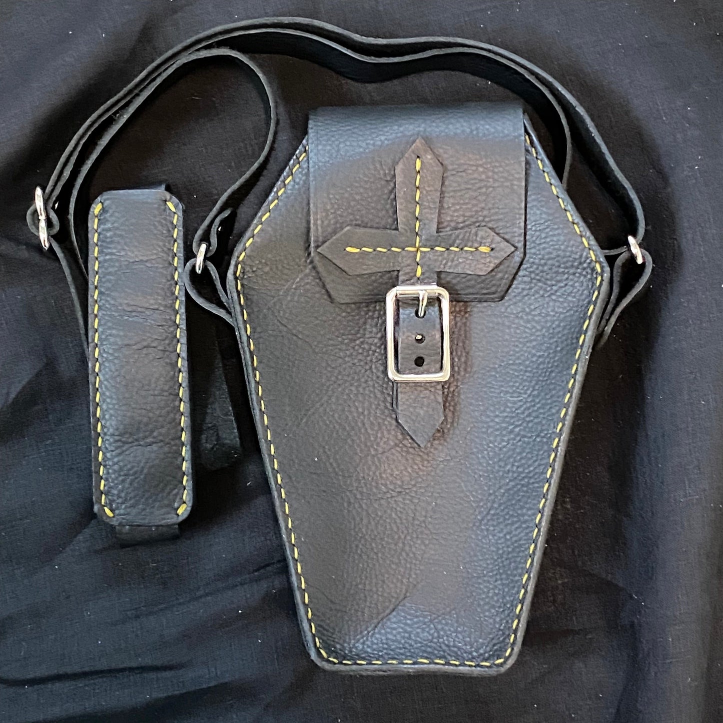 A fantastic and practical statement piece for spooky season (or any season, if we're honest with ourselves) to go with your favorite ass-kicking boots. This handmade leather bag is large enough to hold a phone, keys, wallet, and the hearts of your enemies with room to spare! The standard design includes an adjustable crossbody strap with shoulder pad matching the cross closure.
