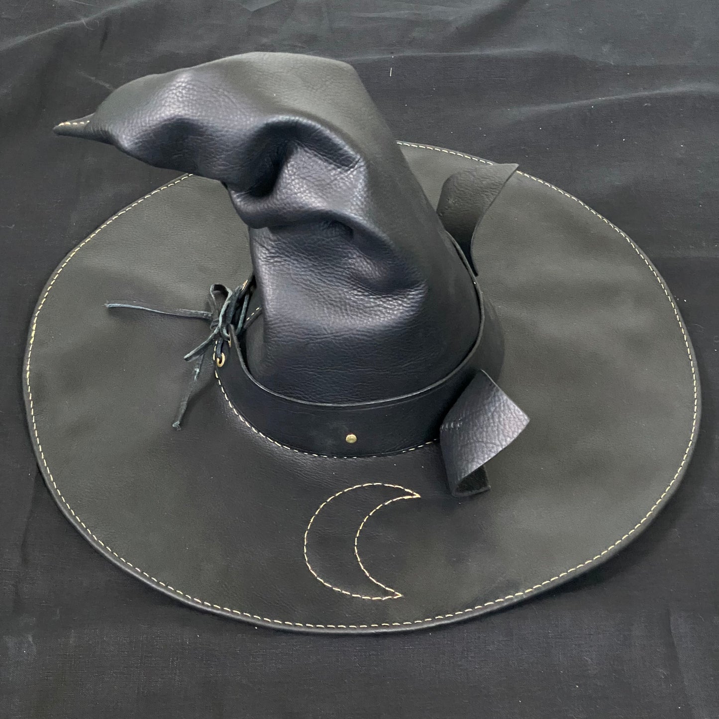 A sturdy, functional, and stylish hat for the discerning witch that can be styled however you like! With a swappable cat ear hat band (1 included with hat) and a wire-reinforced brim, you can wear this hat to the Ren Faire, out in the garden, frolicking in the woods under the moonlight, or to run errands around town! The cone is adjustable and can be worn fully upright or secured bent backwards using the integral loops and strap inside to match your style at any moment.