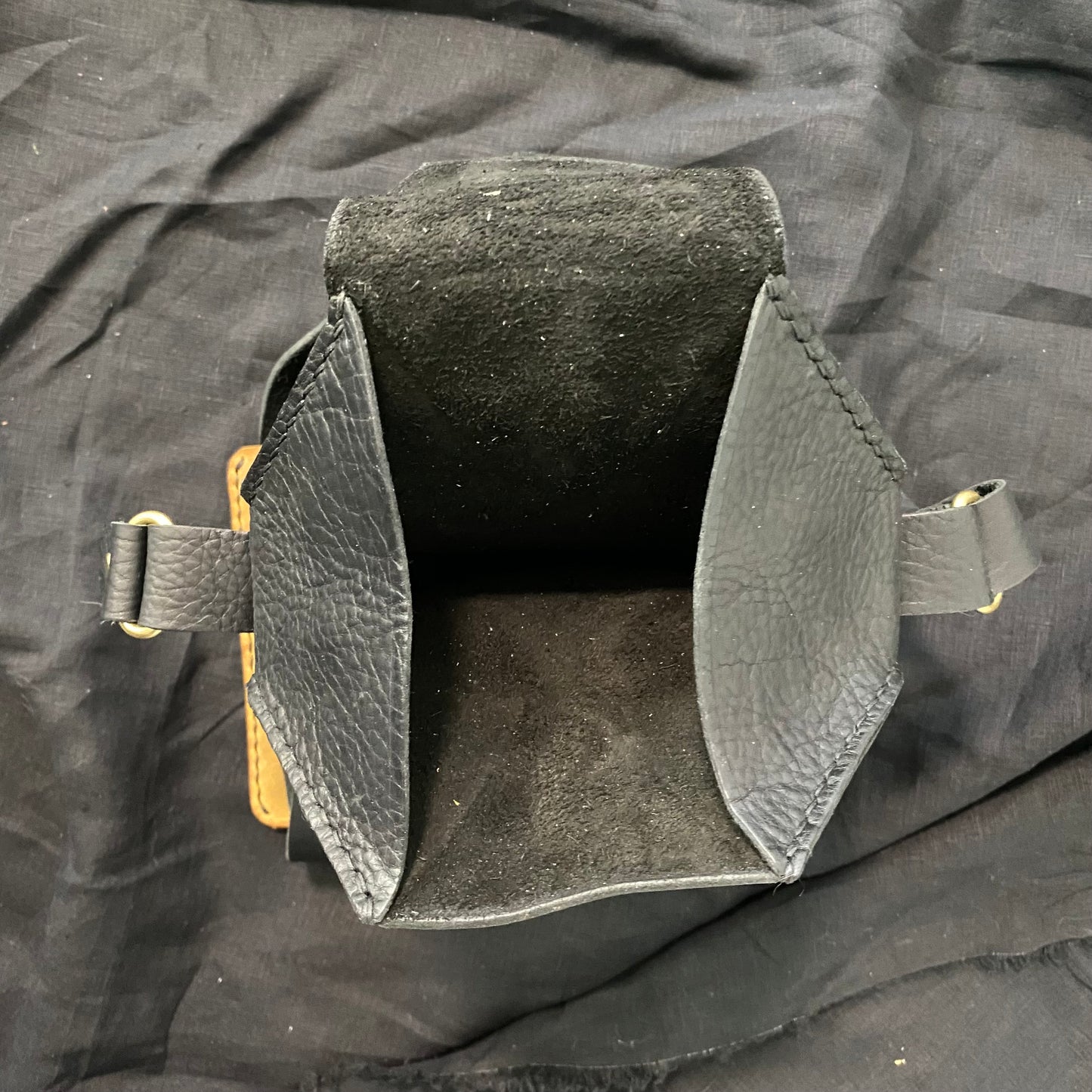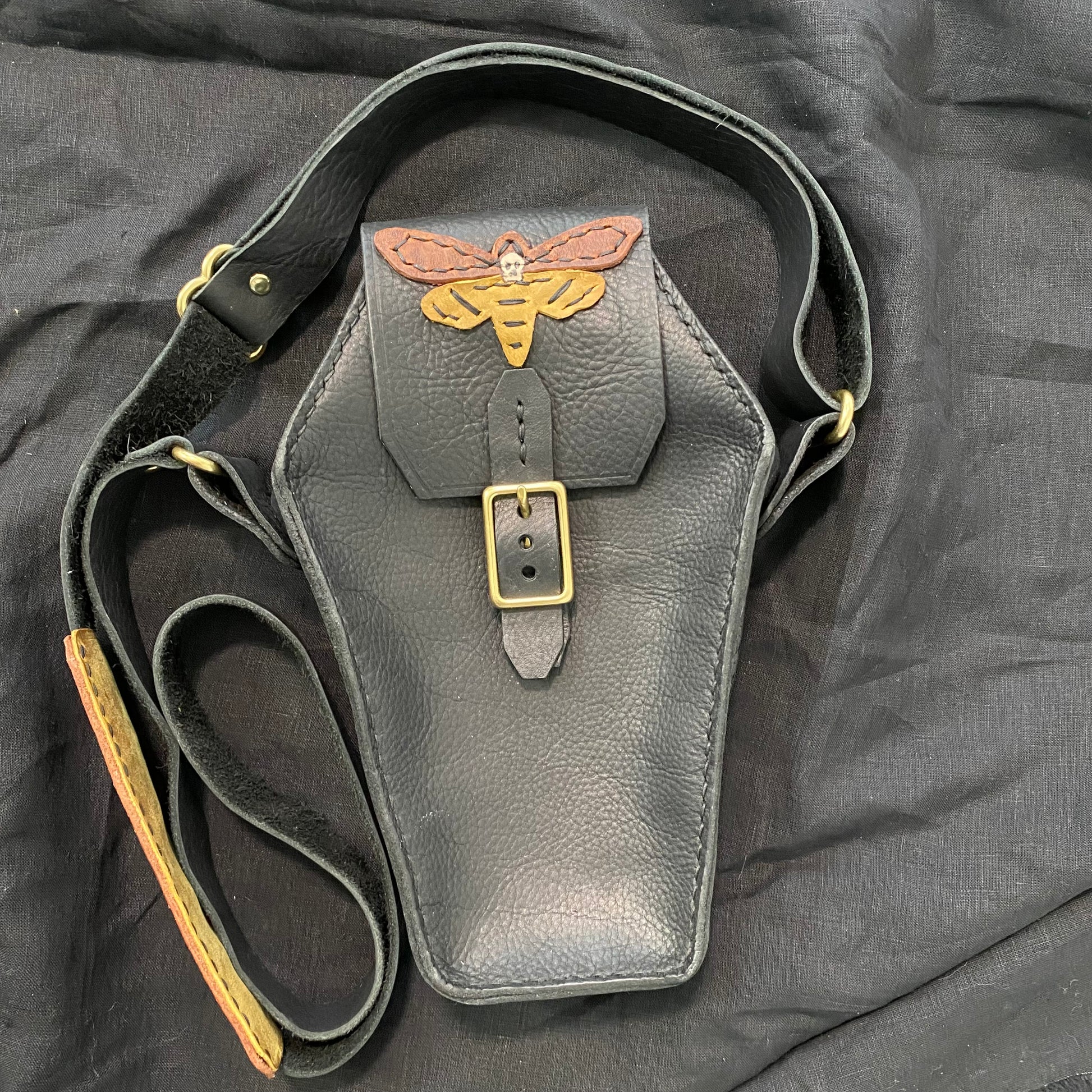 A fantastic and practical statement piece for spooky season (or any season, if we're honest with ourselves). This handmade leather bag is large enough to hold a phone, keys, wallet, and the hearts of your enemies with room to spare! The standard design includes an adjustable crossbody strap with shoulder pad matching the cross closure.