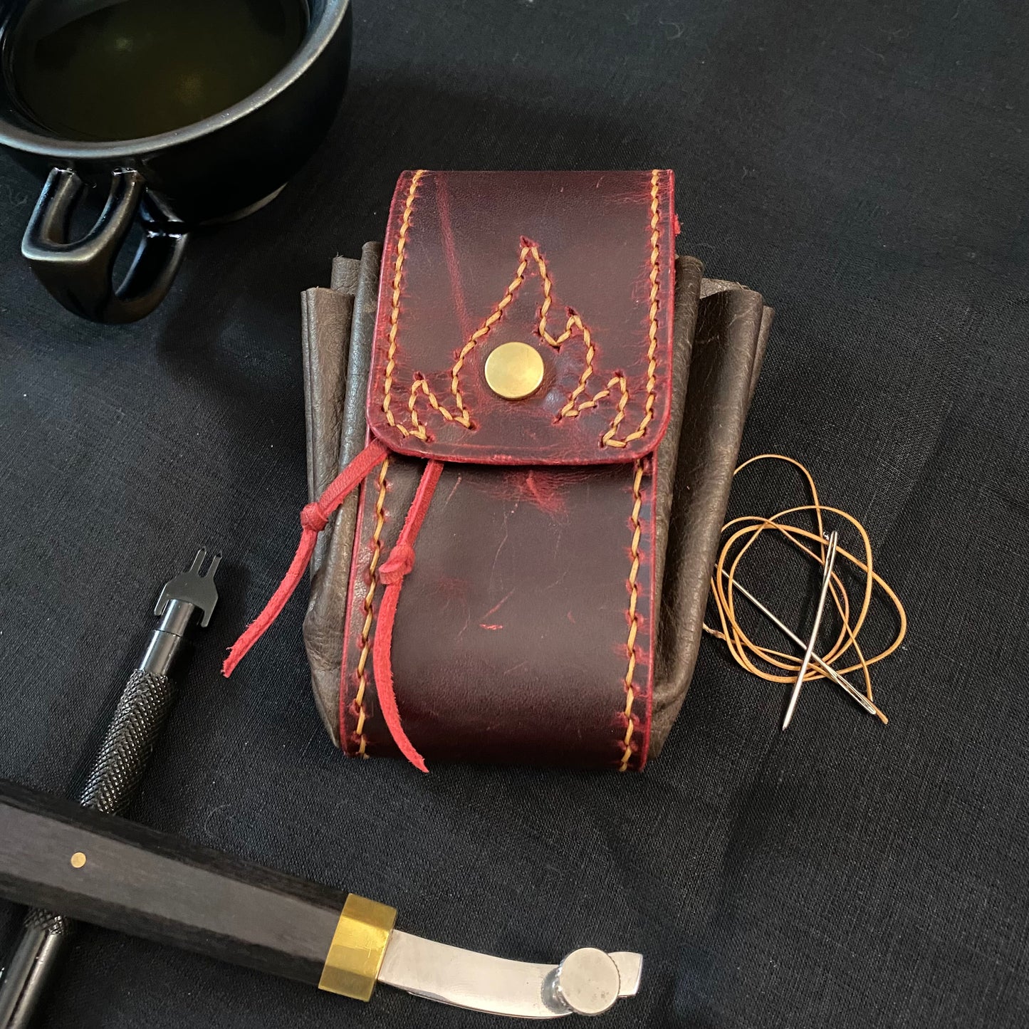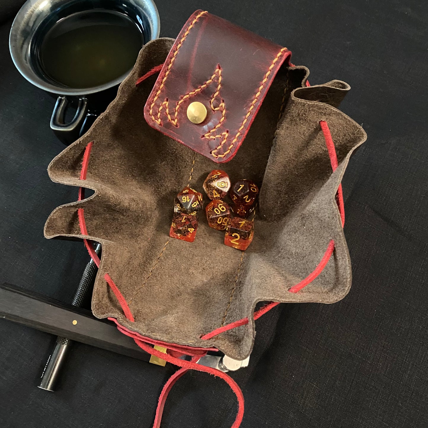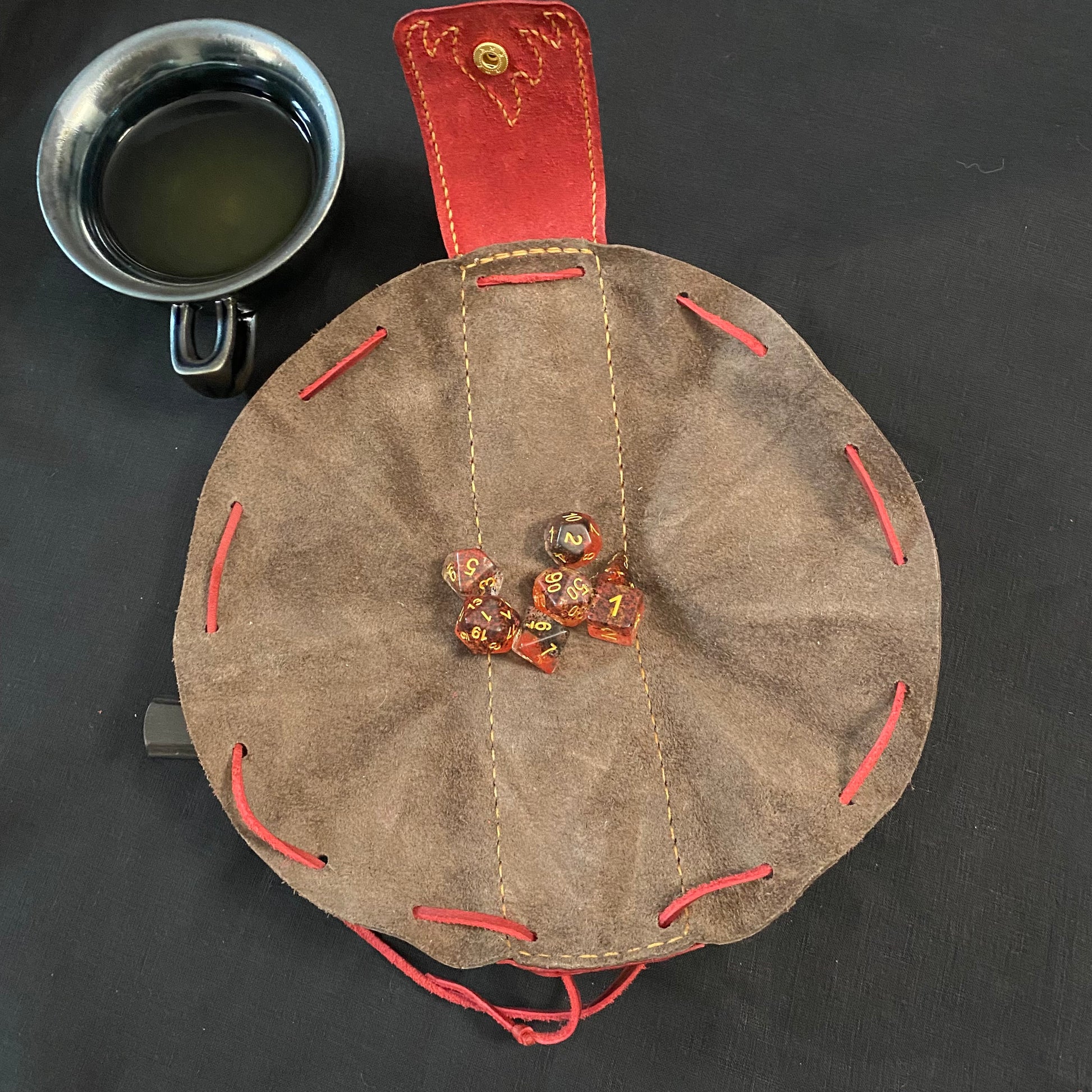 This is the pouch that I use for holding (some of) my dice, but it can also hold coins, trinkets, neat rocks, bones, or anything else you might find interesting! This particular design is inspired by the dark reds and browns characteristic of Fire Nation clothing and features a stitched emblem of the Fire Nation. It holds 6-7 sets of polyhedral dice comfortably. This pouch is designed to fit onto belts up to 2 inches, but can be custom cut to accommodate wider belts upon request. It opens to a flat circle, perfect for rolling dice or for osteomancy! (Dice are not included in the purchase!)