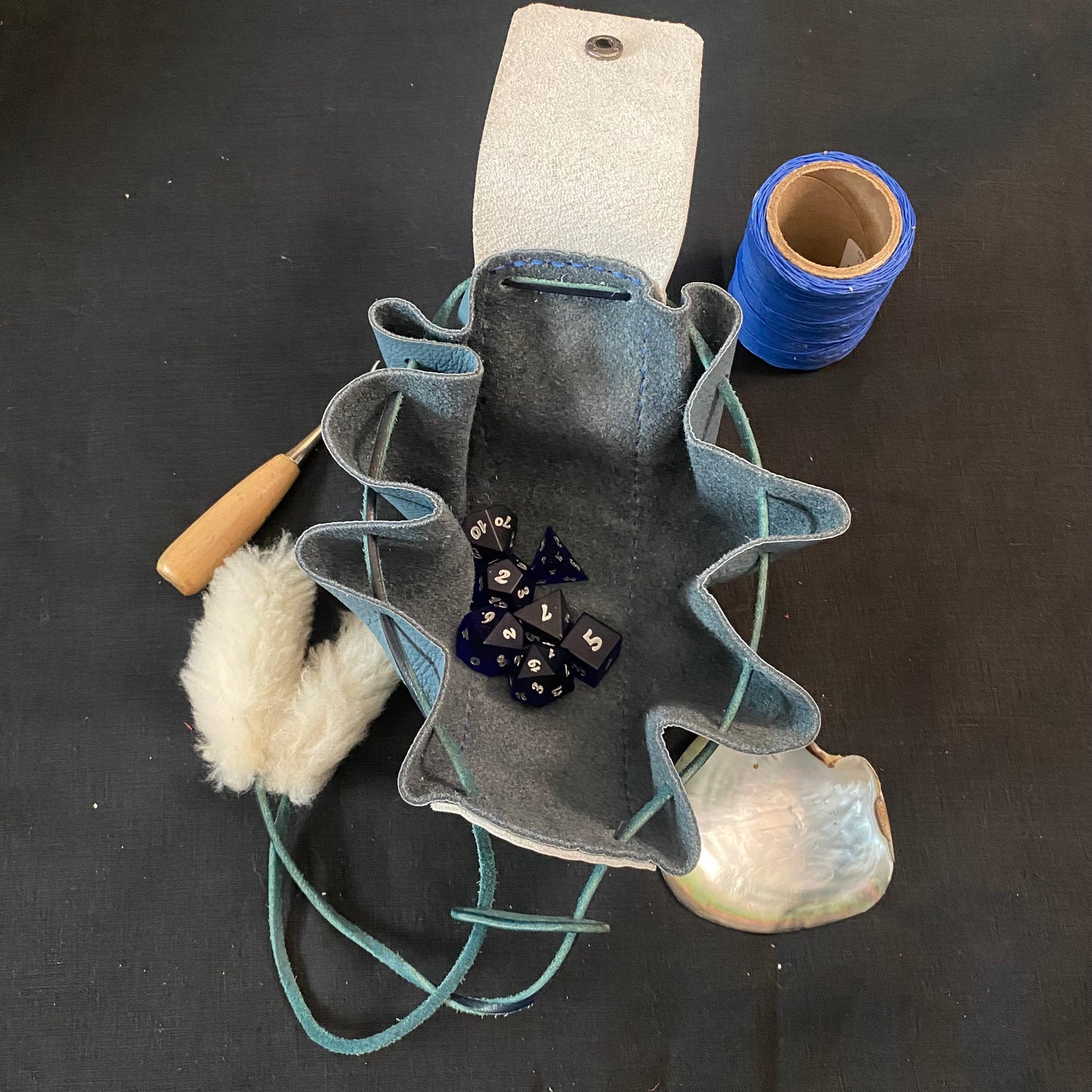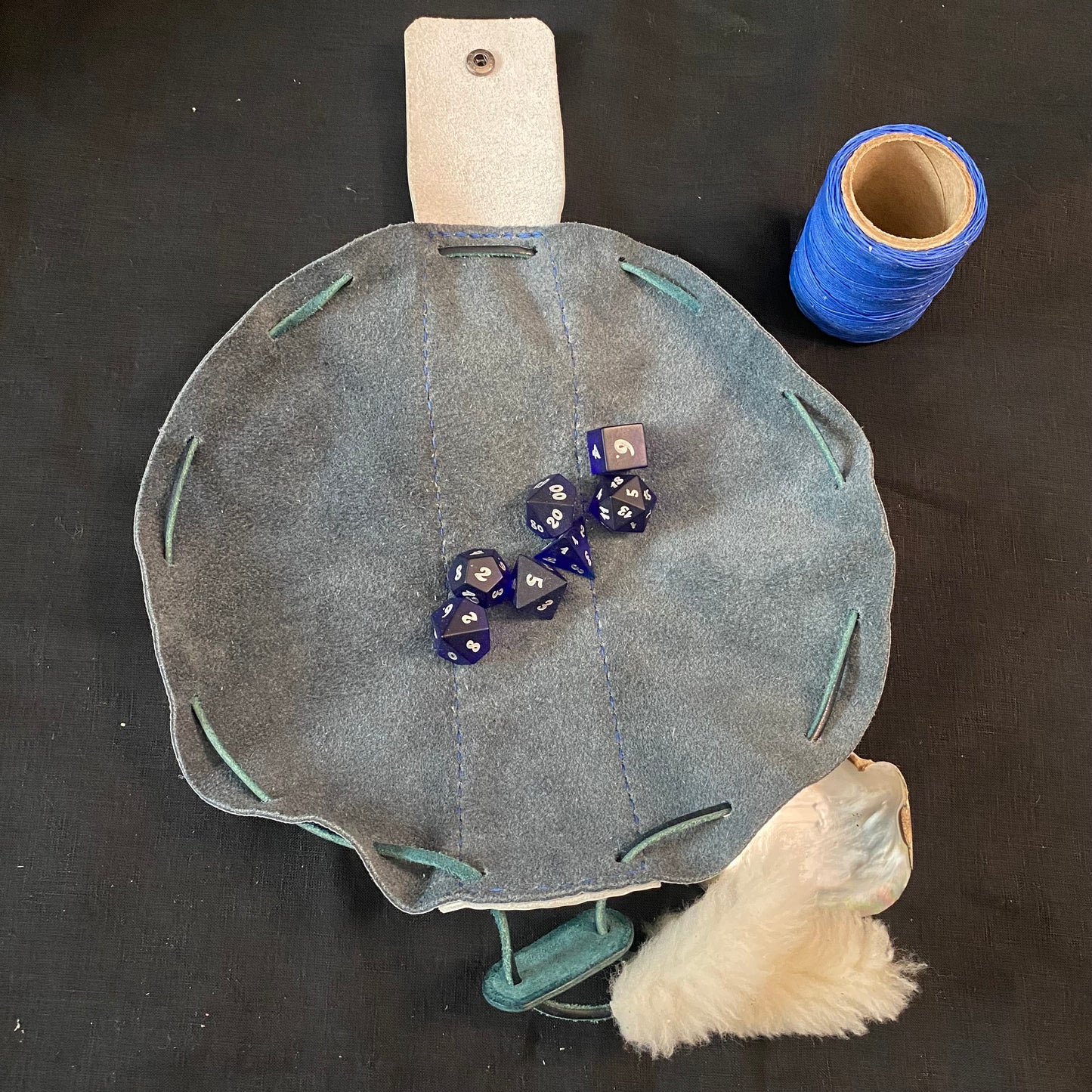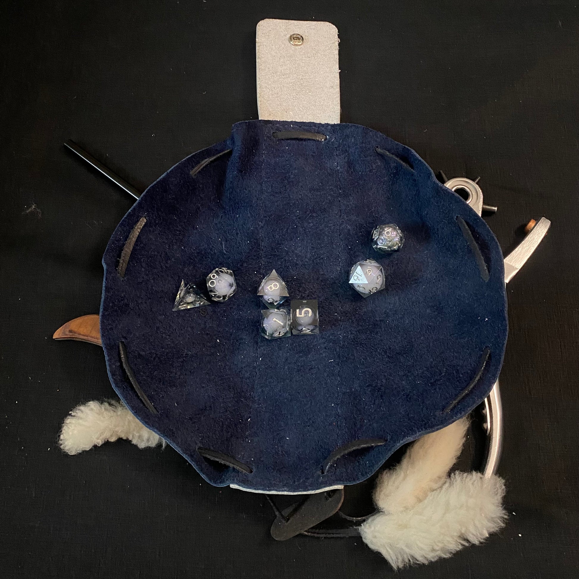 This is the pouch that I use for holding (some of) my dice, but it can also hold coins, trinkets, neat rocks, bones, or anything else you might find interesting! This particular design is inspired by the insulating blue and white clothing of the Northern and Southern Water Tribes, including fur tassels like we see on their clothing. It holds 6-7 sets of polyhedral dice comfortably. This pouch is designed to fit onto belts up to 2 inches, but can be custom cut to accommodate wider belts upon request. It opens to a flat circle, perfect for rolling dice or for osteomancy! (Dice are not included in the purchase!)