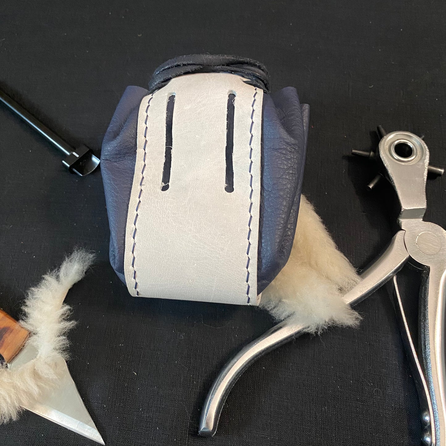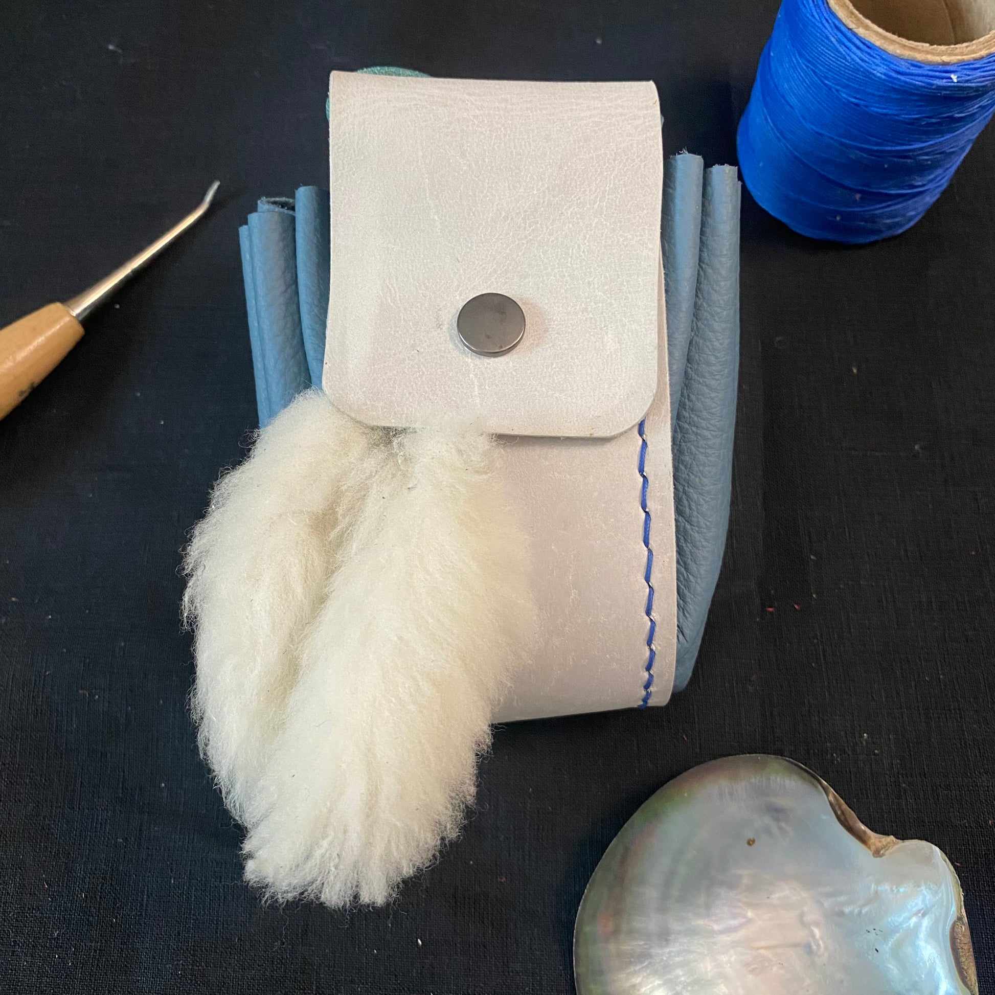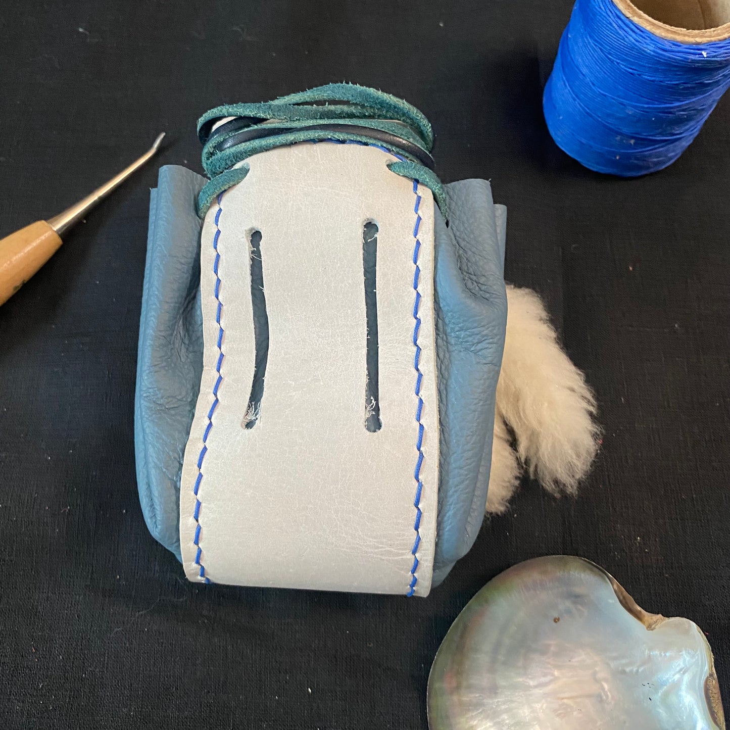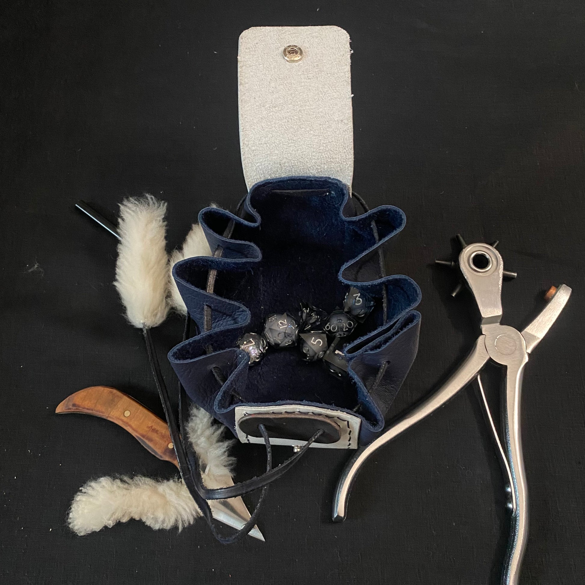 This is the pouch that I use for holding (some of) my dice, but it can also hold coins, trinkets, neat rocks, bones, or anything else you might find interesting! This particular design is inspired by the insulating blue and white clothing of the Northern and Southern Water Tribes, including fur tassels like we see on their clothing. It holds 6-7 sets of polyhedral dice comfortably. This pouch is designed to fit onto belts up to 2 inches, but can be custom cut to accommodate wider belts upon request. It opens to a flat circle, perfect for rolling dice or for osteomancy! (Dice are not included in the purchase!)