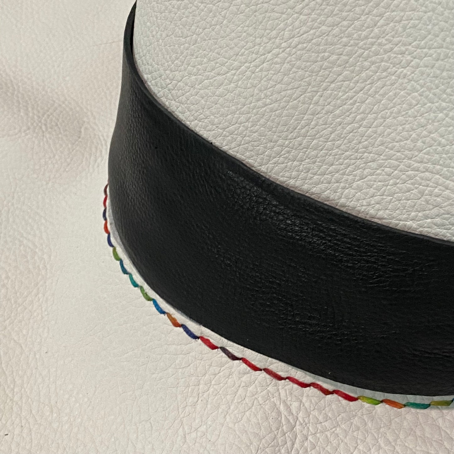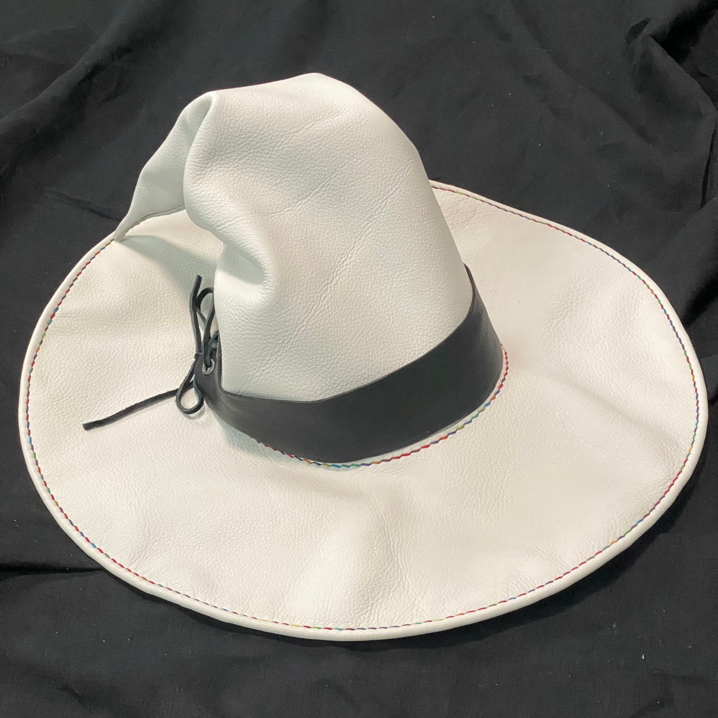 A sturdy, functional, and stylish hat for the discerning witch that can be styled however you like! With a swappable hat band (1 included with hat) and a wire-reinforced brim, you can wear this hat to the Ren Faire, out in the garden, frolicking in the woods under the moonlight, or to run errands around town! The cone is adjustable and can be worn fully upright or secured bent backwards using the integral loops and strap inside to match your style at any moment.